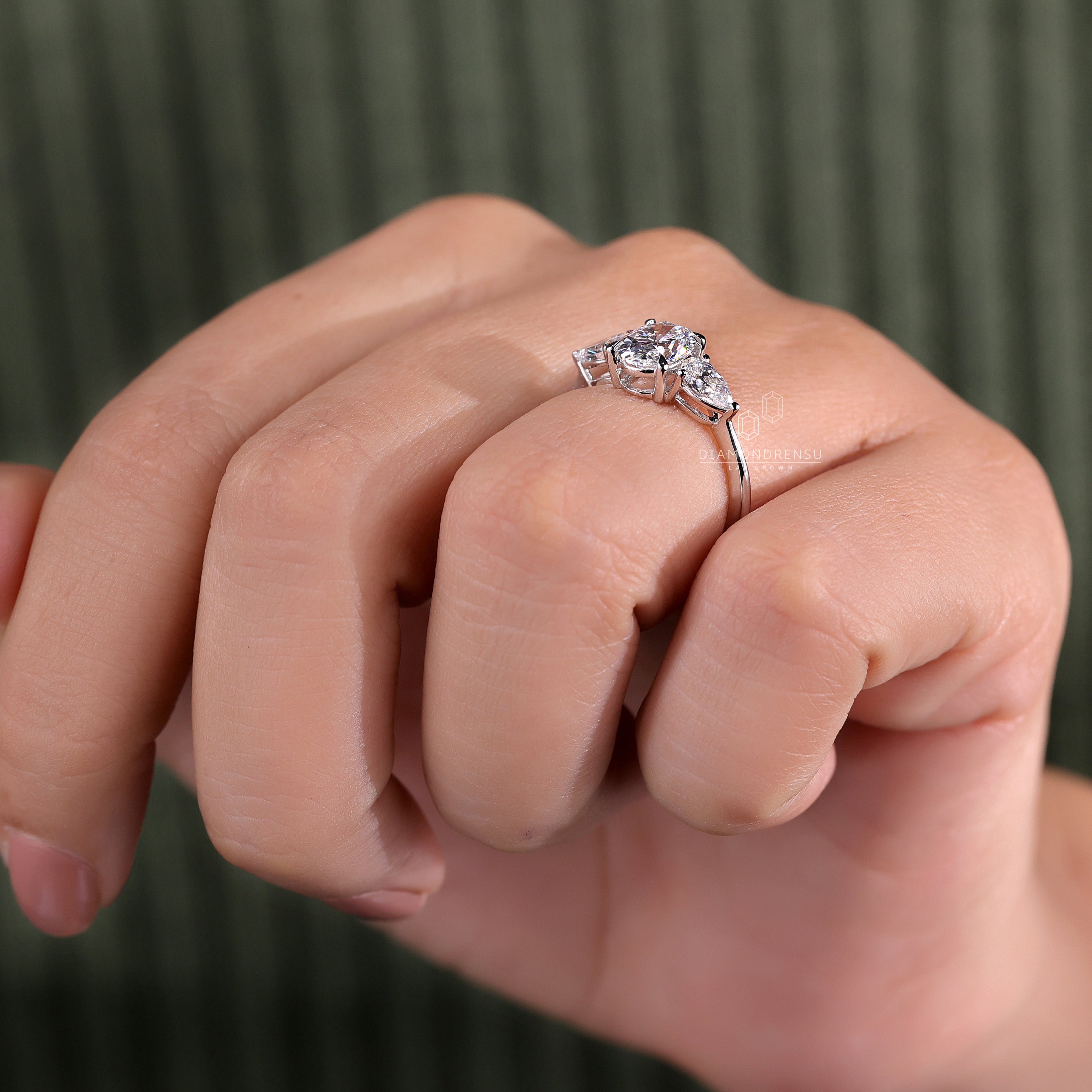 - Three Stone Engagement Ring: A stunning centre oval shaped engagement ring paired with two pear-shaped diamonds.