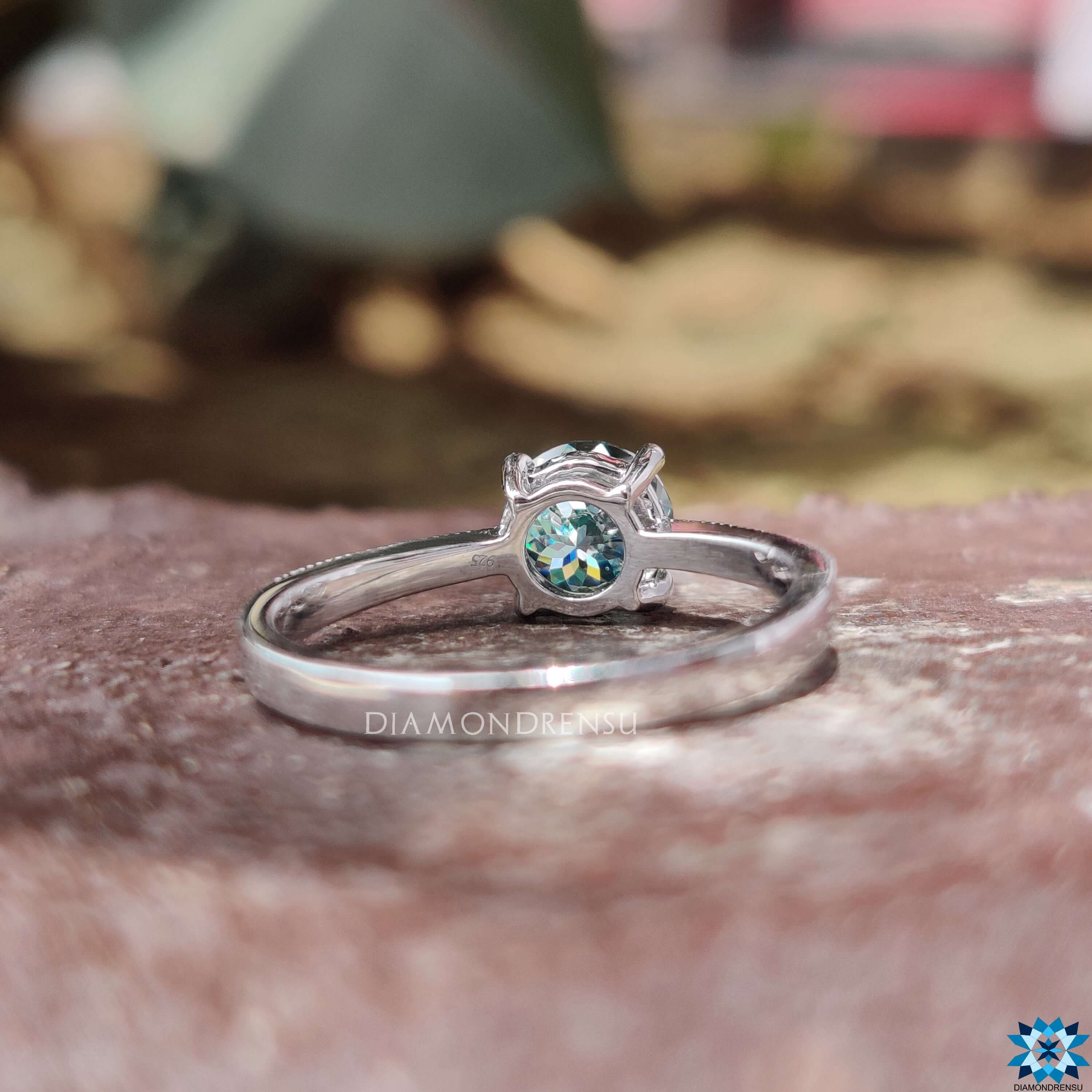 Crafted in a polished white gold ring, the metal’s cool tone pairs well with the cyan blue Moissanite ring, bringing contrast and clarity to the overall design. This combination suits both daily wear and formal settings, offering comfort and balance.